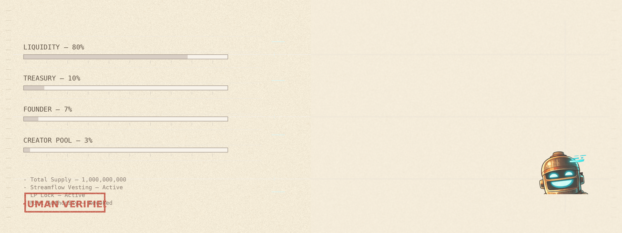 Staged Liquidity Structure 15% of total supply (150M tokens) seeded the initial Raydium pool at launch. The remaining 65% (650M tokens) is locked in a Streamflow vesting contract and streams into the LP Provision Wallet over 16 weeks. Adding tokens to the pool is a separate operational decision.